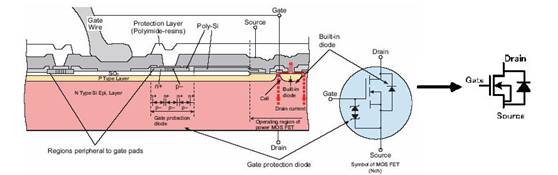 MOS管原理圖上可以看到,漏極和源極之間有一個(gè)寄生二極管。這個(gè)叫體二極管,在驅(qū)動(dòng)感性負(fù)載(如馬達(dá)),這個(gè)二 極管很重要。順便說一句,體二極管只在單個(gè)的MOS管中存在,在集成電路芯片內(nèi)部通常是沒有的。下圖是MOS管的構(gòu)造圖,通常的原理圖中都畫成右圖所示的樣子。(柵極保護(hù)用二極管有時(shí)不畫)