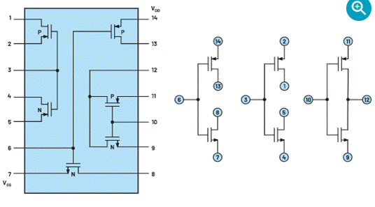 為了在本實(shí)驗(yàn)活動中構(gòu)建邏輯功能,需要使用 ADALP2000模擬部件套件中的CD4007 CMOS陣列和分立式NMOS和PMOS晶體管(ZVN2110A NMOS和ZVP2110A PMOS)。CD4007由3對互補(bǔ)MOSFET組成,如圖1所示。每對共用一個(gè)柵極(引腳6、3和10)。所有PMOSFET(正電源引腳14)以及NMOSFET(地引腳7)的襯底都共用。左邊一對,NMOS源極引腳連接到NMOS襯底(引腳7),PMOS源極引腳連接到PMOS襯底(引腳14)。另外兩對均為通用型。右邊一對,NMOS的漏極引腳連接到PMOS的漏極引腳,即引腳12。