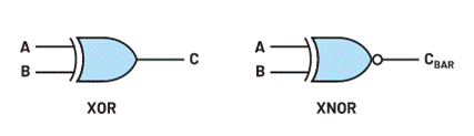 CD4007是一款多功能IC。例如,單個(gè)CD4007可用于構(gòu)建三個(gè)反相器、一個(gè)反相器加上兩個(gè)傳輸門或其他復(fù)雜的邏輯功能,如NAND和NOR門。反相器和傳輸門尤其適合構(gòu)建傳輸門XOR和XNOR邏輯功能。XOR和XNOR邏輯門的示意圖符號如圖2所示。