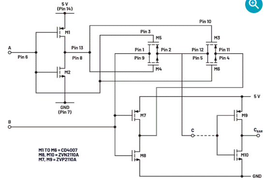 電路中有兩個(gè)邏輯輸入A和B。同相XOR輸出位于節(jié)點(diǎn)C,而該輸出的反相位于節(jié)點(diǎn)CBAR以形成XNOR函數(shù)。
