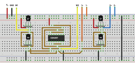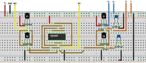 使用四個(gè)獨(dú)立NMOS和PMOS晶體管(ZVN2110A和ZVP2110A)構(gòu)建的反相器對也可以由第二個(gè)CD4007 IC構(gòu)成,或者可以是采用六路反相器IC的CMOS反相器,如74HC04或CD4049。CD4066四通道SPST開關(guān)也可以作為采用CD4007構(gòu)建的開關(guān)的替代器件。