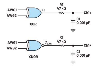 將圖6所示的RC低通濾波器添加到XOR試驗(yàn)板電路中。將示波器通道1連接到RC濾波器輸出。