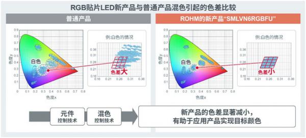 近年來(lái),隨著汽車(chē)電子化程度的提高和功能多樣化的發(fā)展,車(chē)速自動(dòng)控制、車(chē)距檢測(cè)、車(chē)道線檢測(cè)等各種駕駛輔助功能得以廣泛應(yīng)用。為了用儀表盤(pán)等的指示燈顯示這些功能的工作狀態(tài),業(yè)內(nèi)對(duì)于能夠表現(xiàn)各種顏色的RGB貼片LED的需求日益高漲。另外,對(duì)使用RGB貼片LED來(lái)打造車(chē)內(nèi)空間的舒適感和奢華感的內(nèi)飾產(chǎn)品的需求也在不斷增加。在這種背景下,ROHM利用自有的元件技術(shù),通過(guò)精細(xì)地控制RGB元件的發(fā)光特性并提高混色性能,開(kāi)發(fā)出色差更小的RGB貼片LED。