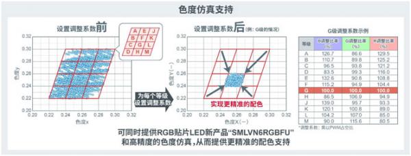 SMLVN6RGBFU為每個(gè)色度等級(jí)設(shè)置了調(diào)整系數(shù),并提供更接近目標(biāo)顏色的配色支持。通過(guò)同時(shí)提供RGB貼片LED新產(chǎn)品和高精度的色度仿真,可以實(shí)現(xiàn)更精細(xì)的配色效果。