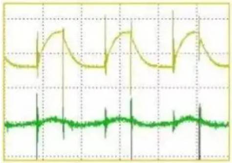 另外,SWITCH一般選用雙極性晶體管或者M(jìn)OSFET,不管是哪種,在其導(dǎo)通和截止的時(shí)候,都會(huì)有一個(gè)上升時(shí)間和下降時(shí)間。這時(shí)候在電路中就會(huì)出現(xiàn)一個(gè)與SWITCH上升下降時(shí)間的頻率相同或者奇數(shù)倍頻的噪聲,一般為幾十MHz。同樣二極管D在反向恢復(fù)瞬間,其等效電路為電阻電容和電感的串聯(lián),會(huì)引起諧振,產(chǎn)生的噪聲頻率也為幾十MHz。這兩種噪聲一般叫做高頻噪聲,幅值通常要比紋波大得多。