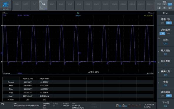 2、類似實(shí)例1的情況,使用ZDL6000示波記錄儀搭配隔離高速電壓采集卡,每通道對地電容小于80pF,在此電容對被測系統(tǒng)影響可忽略的情況下,可直接將單端無源探頭連接被測兩點(diǎn)。圖3是用此方法測量實(shí)例1中RL的波形。