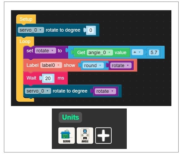 將電位器連接到 M5Stack 內(nèi)核后,需要軟件來(lái)顯示電氣元件的旋轉(zhuǎn)值。UiFlow 軟件將用于顯示電位器的旋轉(zhuǎn)角度(以度為單位),代碼塊包含伺服電機(jī)控制器的三個(gè)主要操作。
