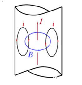 產(chǎn)生趨膚效應(yīng)的本質(zhì)原因是電流和磁場的相關(guān)關(guān)系,用下面的圖來表示: