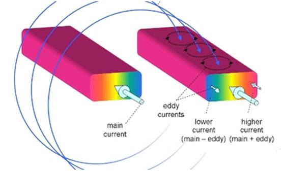如下圖所示,兩個(gè)同方向的導(dǎo)線流通相同方向的電流,在兩個(gè)導(dǎo)線相鄰的位置電流的大小為電流I減去渦流,而在遠(yuǎn)離的一邊,電流為I加上渦流。