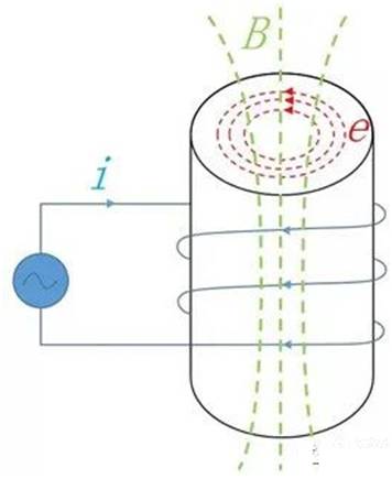 對(duì)一根流過電流為I的導(dǎo)線,在導(dǎo)線的垂直平面形成交變磁場,交變磁場在導(dǎo)體內(nèi)部產(chǎn)生感應(yīng)電動(dòng)勢(shì),感應(yīng)電動(dòng)勢(shì)在導(dǎo)體內(nèi)部形成渦流電流,渦流在導(dǎo)體內(nèi)部與電流的變化趨勢(shì)相反,阻礙電流的變化,渦流的變化在導(dǎo)體表面與電流的變化趨勢(shì)相同。