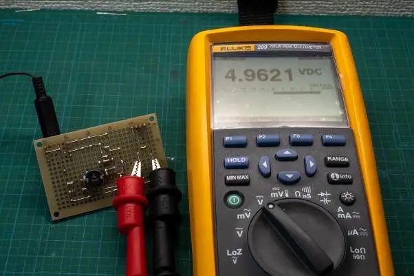 當(dāng)將12V電壓施加到完成的電路時,輸出了5V電壓。由于輸出電壓是通過反饋來維持穩(wěn)定的,因此即使外部電壓波動,也能始終輸出5V。這個開關(guān)穩(wěn)壓器IC可輸出高達(電源電壓 x 0.7V)的電壓,因此理論上即使電壓降至7.2V也能工作。
