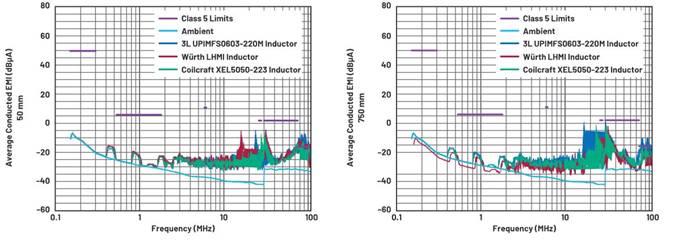 采用三個22 µH屏蔽電感進行測試,如表1所示。在不采用CM扼流圈的相同電路中評估EMI,每個電感都按照能提供最佳性能的方向安裝。比較結果如圖5所示。在本次研究中,Coilcraft XEL電感的FM頻段噪聲抑制性能最佳,與其他3L電感相比,將FM頻段EMI降低5.1 dB。