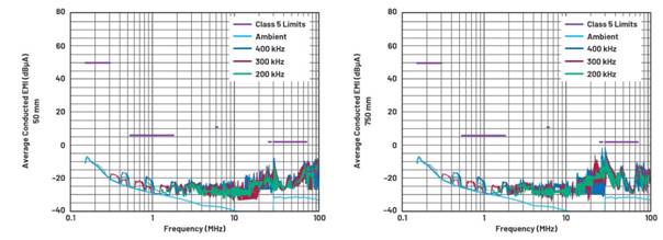 降低開關頻率可以降低給定高頻下的發(fā)射能量。在圖6中,對不使用CM扼流圈的電路執(zhí)行電流探頭CE測試,并比較在200 kHz、300 kHz和400 kHz開關頻率下的測試結果。除RT外的所有組件都保持不變。測試結果顯示,200 kHz時FM頻段內(nèi)的EMI最低,與400 kHz時相比,輻射降低3.2 dB。