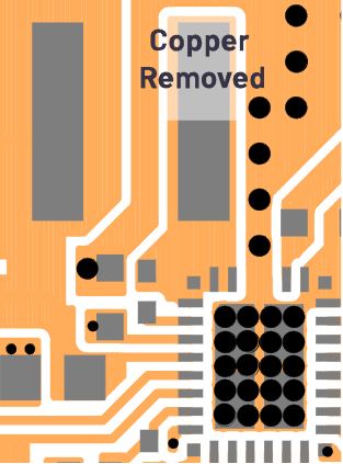 高dV⁄dt開關節(jié)點是一個噪聲源,會產(chǎn)生電容耦合,增加CE中的CM EMI噪聲。它也像天線一樣工作,向空間輻射電磁噪聲,也會影響輻射EMI。因此,盡可能減小PCB布局上的開關節(jié)點面積可以改善EMI性能。為了在PCB電路板上測試這一點,我們切除了部分銅芯,并將電感移動到更靠近IC的位置(如圖7所示),以此減小開關節(jié)點面積。我們測試了切除銅芯之前和之后的EMI,測試結果如圖8所示。