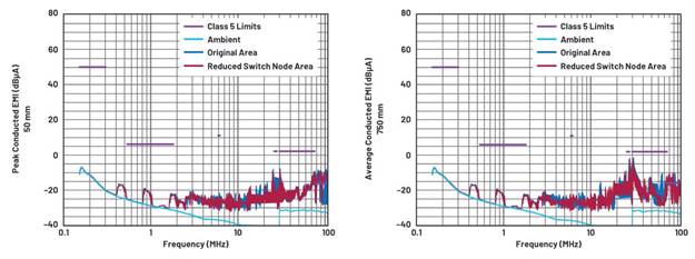 結果顯示,50 mm電流探頭CE測試在105 MHz時降低了1 dB,而750 mm測試沒有明顯改善。這一結果表明,在此應用中,銅芯面積不是影響FM頻段EMI的主要因素。盡管如此,為了實現(xiàn)低EMI的PCB布局,或在設法消除EMI期間,盡量減小開關節(jié)點面積仍然是值得嘗試的。