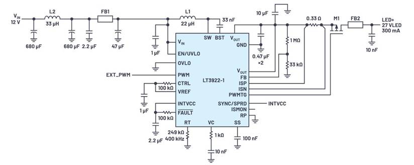 圖2.LT3922-1汽車HUD LED驅(qū)動(dòng)器的簡化原理圖。