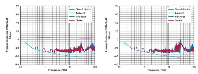 圖4顯示了50 mm和750 mm平均電流探頭CE結(jié)果,對(duì)不安裝扼流圈的初始電路和將扼流圈安裝在LED驅(qū)動(dòng)器電路之前的電路進(jìn)行比較。圖中也顯示了環(huán)境本底噪聲作為參考。FM頻段CE(76 MHz至~108 MHz)降低了8 dBµA以上。