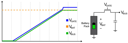 MP279x 系列產(chǎn)品采用高邊架構(gòu),在提供強大保護功能的同時也能最大限度地減少 BOM。此外,高精度電荷泵控制還支持 N 溝道 MOSFET軟導通功能,它無需任何額外的預(yù)充電電路,這進一步將 BOM 尺寸與成本降至很低。軟導通通過緩慢增加保護 FET的柵極電壓來實現(xiàn),它允許小電流流過保護器件以對負載進行預(yù)充電(見圖 3)。通過配置幾個參數(shù)可確保安全的過渡,例如最大允許電流,或直到保護 FET關(guān)斷而無觸發(fā)故障的時間。