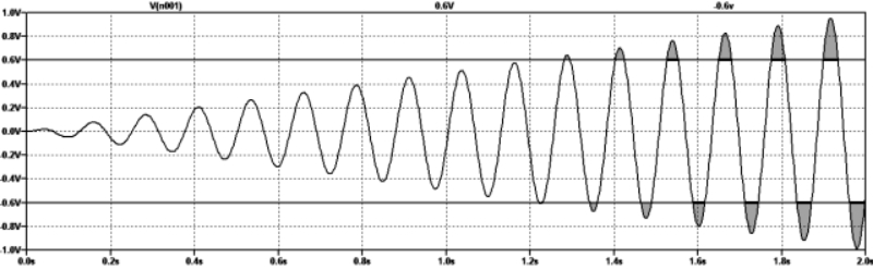 · 聲音再現(xiàn)高度失真,因為上、下峰值的音頻信號被剪切。