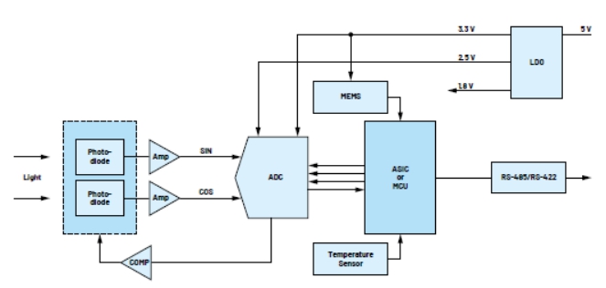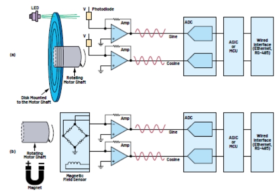 編碼器通過(guò)跟蹤旋轉(zhuǎn)軸的速度和位置來(lái)提供閉環(huán)反饋信號(hào)。光學(xué)和磁編碼器技術(shù)使用非常廣泛,如圖2所示。在通用伺服驅(qū)動(dòng)器中,編碼器用于測(cè)量軸位置,從中可推導(dǎo)出驅(qū)動(dòng)器轉(zhuǎn)速。機(jī)器人和離散控制系統(tǒng)需要準(zhǔn)確且可重復(fù)的軸位置。光學(xué)編碼器由帶有精細(xì)光刻槽的玻璃圓盤(pán)組成。當(dāng)光穿過(guò)圓盤(pán)或從圓盤(pán)反射時(shí),光電二極管傳感器檢測(cè)光的變化。光電二極管的模擬輸出經(jīng)過(guò)放大和數(shù)字化處理后,通過(guò)有線電纜發(fā)送到逆變器控制器。磁編碼器由安裝在電機(jī)軸上的磁體和磁場(chǎng)傳感器組成,傳感器提供正弦和余弦模擬輸出,輸出經(jīng)過(guò)放大和數(shù)字化處理。光學(xué)和磁傳感器信號(hào)鏈類似,如圖2所示。