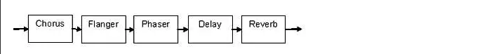 上面的框圖描述了典型音頻應(yīng)用中的數(shù)據(jù)流。每個(gè)效果獲取前一個(gè)效果的輸出,處理數(shù)據(jù),并將其輸出轉(zhuǎn)發(fā)到數(shù)據(jù)處理鏈中的下一個(gè)效果(例如,Phaser 效果的輸出被輸入到 Delay 效果,Delay 效果的輸出被發(fā)送到混響) 。