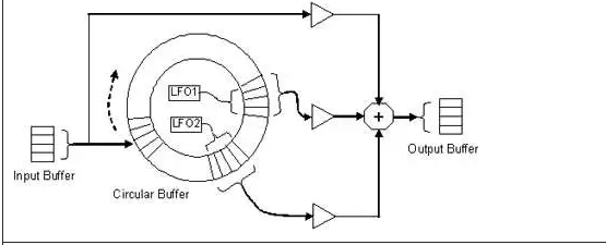 在圖 3 中,Chorus 顯示為輸入與其兩個(gè)延遲副本的組合。音調(diào)偏差是通過延遲輸入副本中緩慢變化的延遲量來建模的。延遲緩慢變化,偏差量及其頻率由低頻振蕩器 (LFO) 控制。