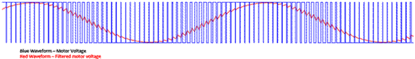 用于降低電機(jī)控制應(yīng)用中可聞噪聲的第一種策略是連續(xù) PWM。PWM是一種技術(shù),通過(guò)導(dǎo)通和關(guān)斷晶體管來(lái)產(chǎn)生輸出波形,從而讓電機(jī)電壓在給定時(shí)間處于高電壓或低電壓狀態(tài)。然后,電機(jī)中的電感對(duì)這些波形進(jìn)行濾波,以便基本上平均輸出波形。調(diào)整占空比(波形導(dǎo)通時(shí)間與關(guān)斷時(shí)間之比)將改變平均電壓。圖2 展示了使用 PWM 生成正弦波的一個(gè)示例。