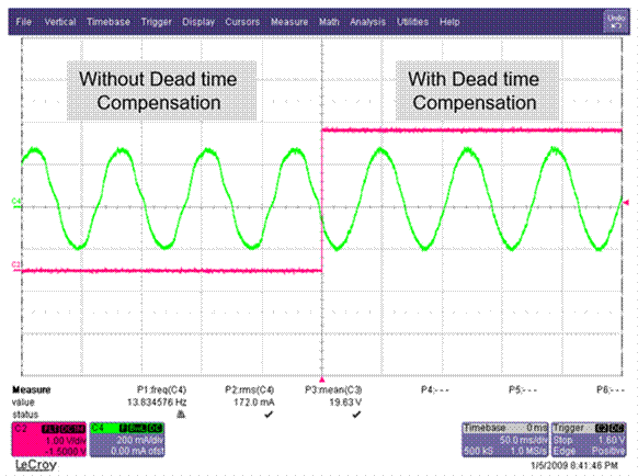 圖 6:實(shí)施 PWM 調(diào)制和死區(qū)時(shí)間補(bǔ)償來(lái)優(yōu)化 MCF8316A 聲學(xué)性能