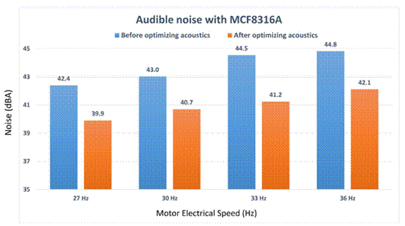 例如,TI 的 MCF8316A BLDC 集成控制柵極驅(qū)動(dòng)器(一款無(wú)傳感器 FOC 電機(jī)驅(qū)動(dòng)器)采用此內(nèi)置功能來(lái)優(yōu)化多種電機(jī)頻率下的聲學(xué)性能,如圖6 所示。