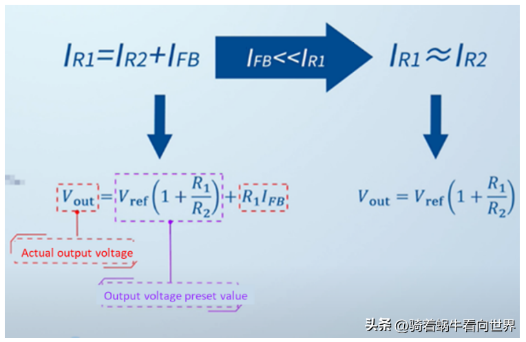 FB 是運(yùn)算放大器(op amp)的負(fù)輸入端,它會汲取一定的電流。當(dāng) FB 電流(IFB)在分壓網(wǎng)絡(luò)中占比較小時,IFB 可忽略不計(jì);當(dāng)其占比較大,即分壓電阻選值較大時,IFB 就不容忽視(見圖 3)。