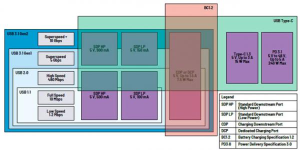 圖1匯總列出每個USB標(biāo)準(zhǔn)允許的功率容量、最大電流和電壓。