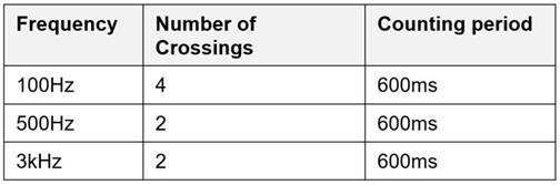音頻信號(hào)檢測的基本原理如圖 1所示。系統(tǒng)設(shè)計(jì)考慮三個(gè)參考頻率:100 Hz、500 Hz 和 3 kHz。對(duì)于給定的信號(hào),系統(tǒng)計(jì)算在一定時(shí)間內(nèi)該信號(hào)的頻率與參考頻率交叉的次數(shù)。僅考慮從低頻到高頻的交叉;例如,50 Hz 至 150 Hz 將計(jì)入 100 Hz,而 150 Hz 至 50 Hz 則不計(jì)入 100 Hz。如果信號(hào)與兩個(gè)參考頻率中的任意一個(gè)交叉的次數(shù)達(dá)到表 1中指定的少次數(shù),則設(shè)計(jì)會(huì)將信號(hào)視為音頻。