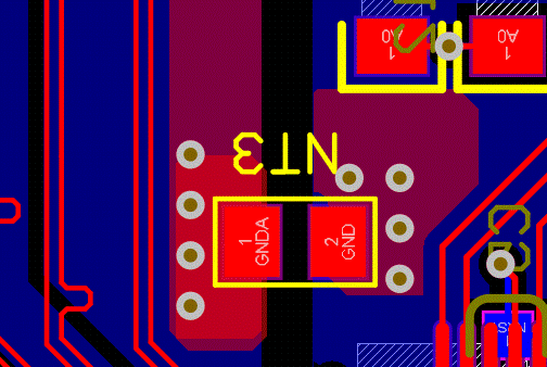 分離地平面:將地線分為模擬地和數(shù)字地兩個(gè)區(qū)域,并使用兩個(gè)獨(dú)立的地平面來(lái)布線。這樣可以防止模擬信號(hào)和數(shù)字信號(hào)間的互相干擾,其中,模擬地與數(shù)字地的距離不下于1mm,由于結(jié)構(gòu)限制畫(huà)不了這么寬的則可適當(dāng)?shù)臏p小。