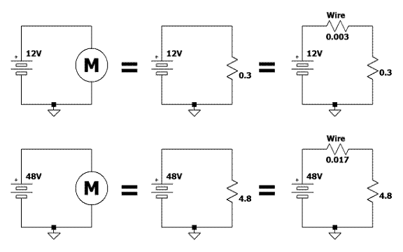 根據(jù)上面計(jì)算的數(shù)據(jù),現(xiàn)在可以模擬使用不同部分的電纜為上述12V和48V電壓的電機(jī)供電。目的是找出在相同功率下,接線是否經(jīng)過使用兩個(gè)電壓時(shí)溫度急劇升高。對(duì)于模擬,僅考慮穩(wěn)態(tài)(而不是浪涌)下的發(fā)動(dòng)機(jī)運(yùn)行。