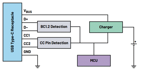 BC1.2檢測IC支持傳統(tǒng)的USB適配器。雖然更新的設備更廣泛地采用USB Type-C,但許多應用仍然使用舊的USB規(guī)格。BC1.2兼容端口采用D+/D-引腳來傳輸電源的功率容量,而不是CC引腳。BC1.2檢測IC讀取D+/D-引腳,為仍然使用傳統(tǒng)USB標準的應用配置充電。