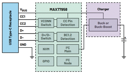 獨立PD控制器的一個示例是MAX77958(圖4)。MAX77958具有兩個獨特功能:非易失性存儲器和直接控制配套充電器的I 2 C主端口。這兩個功能消除了對外部MCU的需求,也無需開發(fā)定制固件。