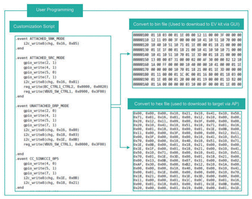 定制腳本是使用簡單、易于使用的命令在GUI中編寫的。該軟件將定制腳本轉換為十六進制格式,并將其寫入IC配置區(qū)域。開發(fā)人員可以根據(jù)基于其應用需要提供的功能來定義簡單的函數(shù)和序列。