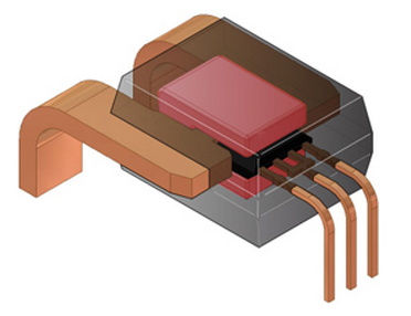 圖 1 ACS 封裝的內(nèi)部結(jié)構(gòu),顯示 U 形初級銅導(dǎo)體和單個倒裝芯片安裝的霍爾 IC。