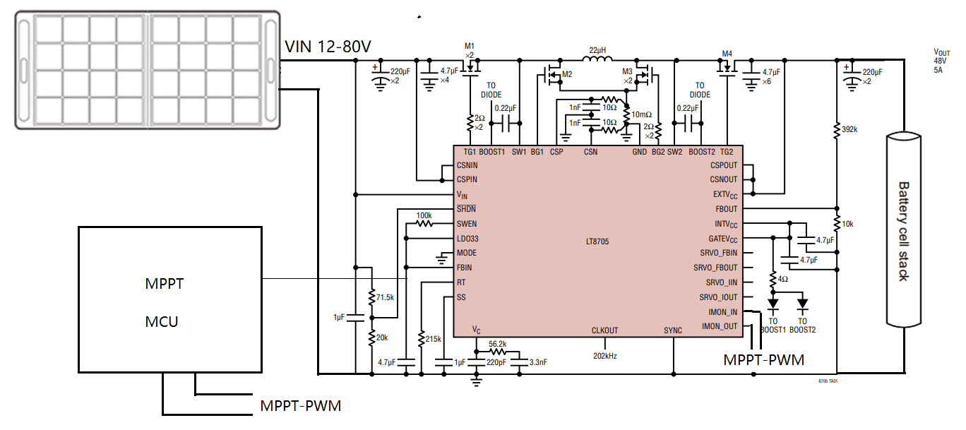 今天我們要講到的是,ADI推出的LT8705降壓 - 升壓控制器 提供了一種極好的方法來解決工作電壓高達(dá)80V的系統(tǒng)中的可變性問題,因?yàn)樗梢越邮?.8至80V的輸入電壓,并在輸出端提供1.3V至80V的電壓,可以解決當(dāng)下流行的4塊光伏板串聯(lián)輸入充電(電壓高達(dá)72V)與12V車載充電的寬范圍輸入轉(zhuǎn)換的問題,這使得設(shè)計(jì)能夠與眾多太陽(yáng)能電池板設(shè)備連接,通過運(yùn)行一個(gè)程序來實(shí)現(xiàn)最大功率點(diǎn)跟蹤(MPPT) 和最大限度地利用太陽(yáng)能電池轉(zhuǎn)換的能量來進(jìn)一步改進(jìn)系統(tǒng)。