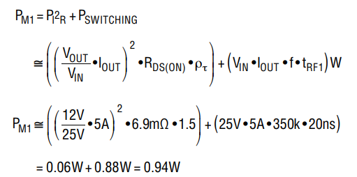 MOSFET 的選擇基于額定電壓、CRSS和 RDS(ON) 值。應(yīng)確保器件的規(guī)格是針對(duì)可用柵極電壓幅度下的工作而擬定的,這一點(diǎn)很重要。在該場(chǎng)合中電壓幅度為 6.35V,可使用具有規(guī)格在 VGS = 4.5V 的 RDS(ON) 數(shù)值的 MOSFET選擇 M1 和 M2:當(dāng)最大輸入電壓為 25V 時(shí),應(yīng)采用額定電壓至少為 30V 的 MOSFET。由于我們尚不知曉實(shí)際熱阻(電路板設(shè)計(jì)和氣流有重大的影響),因此我們假設(shè)從結(jié)點(diǎn)至環(huán)境的 MOSFET 熱阻為 50°C/W。如果我們針對(duì)最大結(jié)溫 TJ(MAX) = 125°C 進(jìn)行設(shè)計(jì),則可計(jì)算最大可容許功率耗散。首先,計(jì)算最大功率耗散: