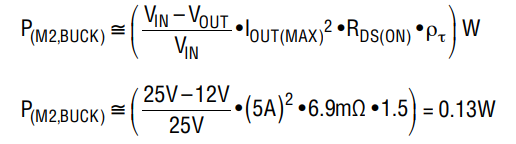可通過選擇一個(gè)較低的開關(guān)頻率來降低 0.88W 的最大開關(guān)功耗。由于該計(jì)算是近似的,因此應(yīng)在 PCB 上測(cè)量實(shí)際的上升和下降時(shí)間以獲得更好的功耗估計(jì)。當(dāng)電路工作于降壓區(qū)時(shí),M2 中的最大功率耗散出現(xiàn)在最大輸入電壓下。若采用 6.9mΩ FDMS7672,則功率耗散為:
