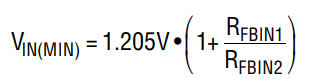 通過在 VIN、FBIN 和 GND 之間連接分壓電阻,F(xiàn)BIN 引腳可提供一種用于調(diào)節(jié)輸入電壓或創(chuàng)建欠壓閉鎖功能的方法。請(qǐng)參閱 “方框圖” 中的誤差放大器 A3,當(dāng) FBIN 低于1.205V 基準(zhǔn)時(shí),VC 會(huì)拉低。例如,倘若 VIN 由一個(gè)阻抗相對(duì)較高的電源 (即:太陽(yáng)能板) 提供,且吸收電流把 VIN拉至一個(gè)預(yù)設(shè)限值以下,則 VC 將被降低,從而減小從輸入電源吸收的電流并限制電壓降。請(qǐng)注意,在強(qiáng)制連續(xù)模式中(MODE 引腳為低電平)使用該功能會(huì)導(dǎo)致從輸出吸收電流并迫使其進(jìn)入輸入端。如果不需要這種運(yùn)行方式,則使用不連續(xù)或突發(fā)模式操作。如需設(shè)定最小輸入電壓或輸入電壓穩(wěn)壓值,可采用下式: