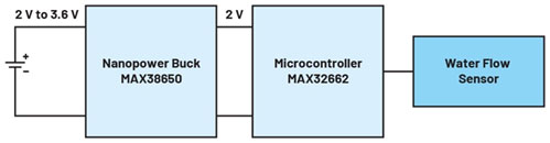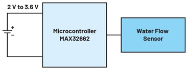 采用電池供電的電路必須具備高能效,這樣電池才能長時間持續(xù)供電。為此,應(yīng)當(dāng)選擇節(jié)能型元器件并將其整合到系統(tǒng)中。電路中的構(gòu)建模塊越少,整個系統(tǒng)的能效就越高。圖1所示的電水表就是一種電池供電設(shè)備。該系統(tǒng)采用MAX32662微控制器,僅有一個電源電壓。輸入電壓介于1.71 V和3.63 V之間。