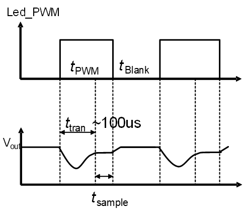 圖 7 展示了智能手表 LED 的逐周期負載情況。PWM 負載包含兩個階段:瞬態(tài)時間 (ttran) 和采樣時間 (tsample)。ttran 測量升壓轉(zhuǎn)換器在發(fā)生負載電流或電源電壓突變后快速穩(wěn)定至目標(biāo)輸出電壓的時間。tsample 是光電二極管穩(wěn)定后的恒定值。