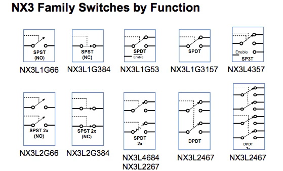 極數(shù)表示公共端子(或活動(dòng)觸點(diǎn))的數(shù)量,而擲數(shù)表示公共側(cè)可以連接的備用端子的數(shù)量。每個(gè)封裝中的開關(guān)可以是單開關(guān)、雙開關(guān)或多個(gè)開關(guān)(通常是偶數(shù))。這些開關(guān)可以單獨(dú)激活,也可以同時(shí)激活。恩智浦高性能模擬開關(guān)產(chǎn)品組合包含采用上述每種配置的設(shè)備。NX3 系列提供所有標(biāo)準(zhǔn)配置 SPST、SPDT……單、雙、四。