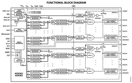 下圖(圖1)為AD5362內(nèi)部框圖,它是一款集成8通道16位的DAC,它提供的緩沖電壓輸出范圍為基準(zhǔn)電壓源的4倍,各DAC的增益和失調(diào)可以獨(dú)立進(jìn)行調(diào)整,以消除誤差。該器件分成兩組,每組4個(gè)DAC,具有更高的靈活性,且每組的輸出范圍可單獨(dú)通過一個(gè)偏移DAC調(diào)節(jié)。
