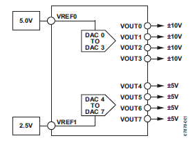 根據(jù)AD5362的描述,我們了解到器件內(nèi)部DAC0-DAC3使用一個(gè)基準(zhǔn)源VREF0,DAC4-DAC7使用另外一個(gè)基準(zhǔn)源VREF1,所以可以利用不同的基準(zhǔn)電壓值來實(shí)現(xiàn)不同的DAC輸出范圍,如下圖(圖2)所示: