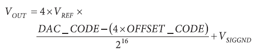 在使用2.5V電壓基準(zhǔn)的時(shí)候,±5V標(biāo)稱輸出可以發(fā)生偏移,產(chǎn)生−10V至 0V或0V至+10V輸出。但是使用5V基準(zhǔn)電壓時(shí),產(chǎn)生±10V標(biāo)稱輸出,卻無法利用偏移DAC寄存器產(chǎn)生0V至+20V輸出,因?yàn)檫@超出了電源和裕量限制。DAC輸出電壓由以下公式?jīng)Q定,值得注意的是OFFSET寄存器是14位的,AD5362本身是16位的,所以需要將OFFSET_CODE乘以4。VSIGGND為相關(guān)SIGGND引腳上的電壓,通常為0V。