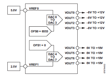 AD5362內(nèi)部有兩個(gè)OFFSET寄存器:OFS0和OFS1。OFS0控制DAC 0至DAC 3的偏移,OFS1控制DAC 4至DAC 7的偏移。AD5362內(nèi)部偏移DAC是14位的且默認(rèn)值為0X2000,也就是8,192,跨度為基準(zhǔn)電壓值的四倍。用戶理論上最多可以將輸出范圍上移或下移10V,不過輸出只能在電源和裕量要求的限制范圍內(nèi)調(diào)整。