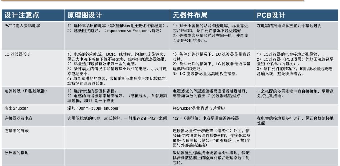 Layout注意事項: LC filter 盡量靠近芯片來減少功放開關節(jié)點電磁輻射影響區(qū)域;盡量采用小尺寸的電感;讓 LC filter遠離PVDD走線以及連接器;對連接器進行屏蔽是最有效的方法。